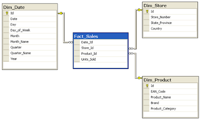 Example: Fact.Sales is the fact table and there are three dimension tables Dim.Date, Dim.Store and Dim.Product. Each dimension table has a primary key on its PK column, relating to one of the columns (viewed as rows in the example schema) of the Fact.Sales table's three-column (compound) primary key (Date_FK, Store_FK, Product_FK). The non-primary key [Units Sold] column of the fact table in this example represents a measure or metric that can be used in calculations and analysis. The non-primary key columns of the dimension tables represent additional attributes of the dimensions (such as the Year of the Dim.Date dimension).